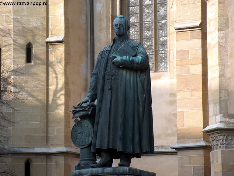 statuia episcopului G. D. Teusch din fata Catedralei Evanghelice Sf. Maria. fotografie din 2005