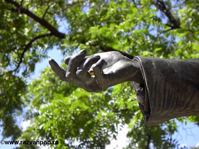 detaliu al statuii. mâna dreaptă a lui Bariţiu, îndreptată spre Palatul ASTRA. fotografie realizată în 2004