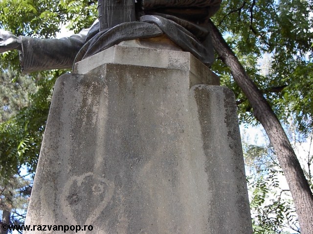 detaliu al statuii. se poate observa cartea ce o ţine în mâna stângă precum şi semnătura sculptorului bucureştean. fotografie realizată în 2004